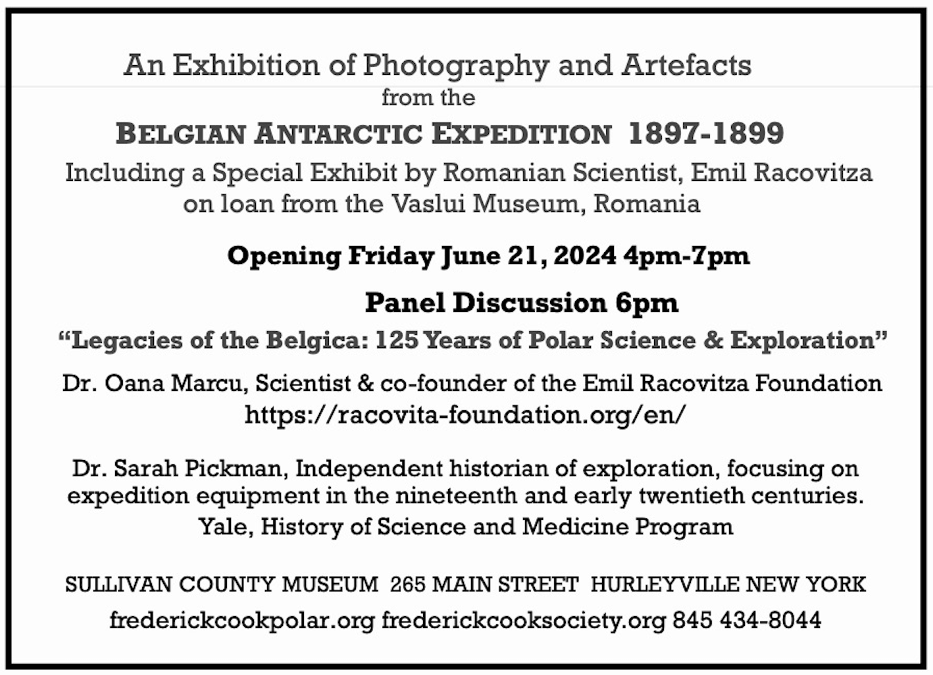 Cu ocazia împlinirii a 125 de ani de la Expediția Belgiană în Antarctica, Societatea Frederick Cook va prezenta o expoziție specială de desene și fotografii ale savantului român, Emil Racoviță (1868 –1947). Racoviță a fost unul dintre oamenii de știință selectați pentru a face parte din echipajul internațional al Belgicăi, fiind biologul expediției. El era și un artist talentat care a realizat numeroase schițe și fotografii în timpul expediției. Mai târziu, în cariera sa de biolog al adâncurilor, Racoviță a înființat în România primul Institut de Speologie din lume și a explorat peste 1.400 de peșteri în România, Franța, Spania, Algeria, Italia și Slovenia. A fost președinte al Academiei Române timp de patru ani și a devenit unul dintre cei mai îndrăgiți promotori ai Științelor Naturale din România.