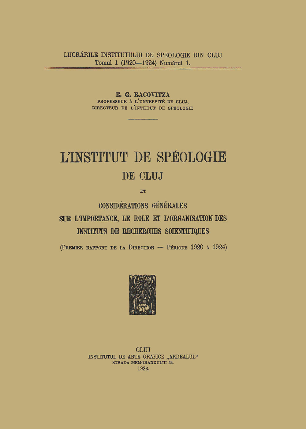 L’Institut de Spéologie de Cluj et considérations générales sur l’importance, le rôle et l’organisation des instituts de recherches scientifiques. Premier rapport de la direction, période 920 à 1924. Lucrările Institutului de Speologie din Cluj. Travaux de l’Institut de Spéologie de Cluj, Cluj, I, 1926, p. 1-50 + anexe, p. 1-10.