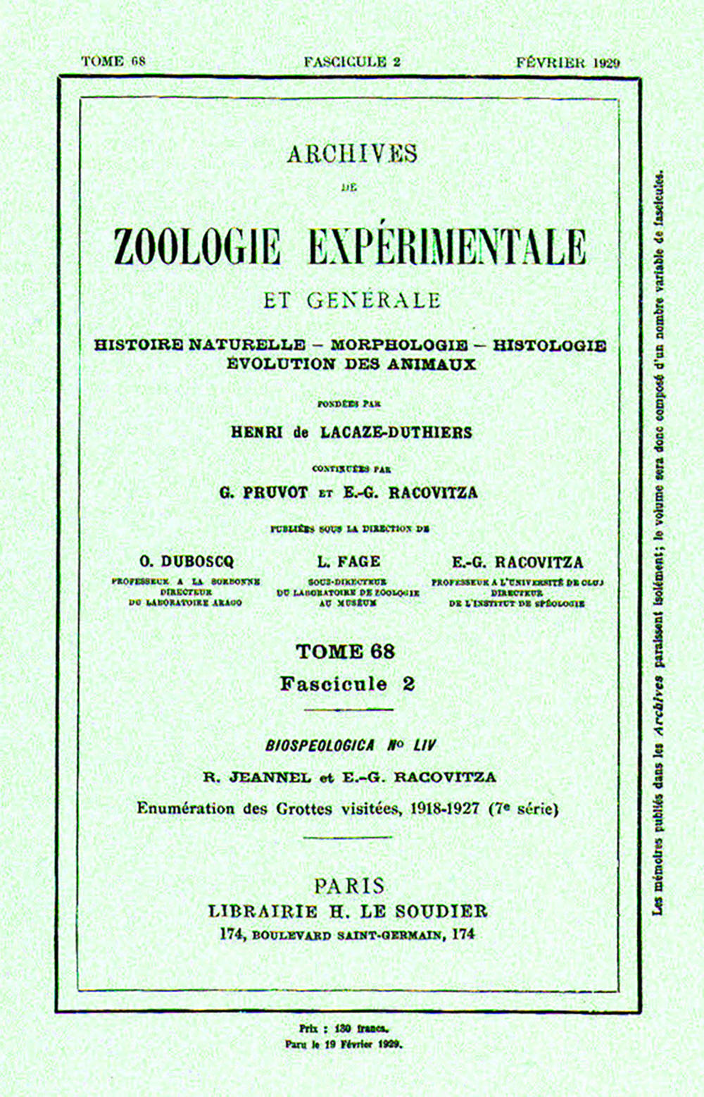 Essai sur les problèmes biospéologiques. Biospeologica I. Archives de Zoologie expérimentale et générale, Paris, 4-ème série, VI, 1907, p. 371-488.