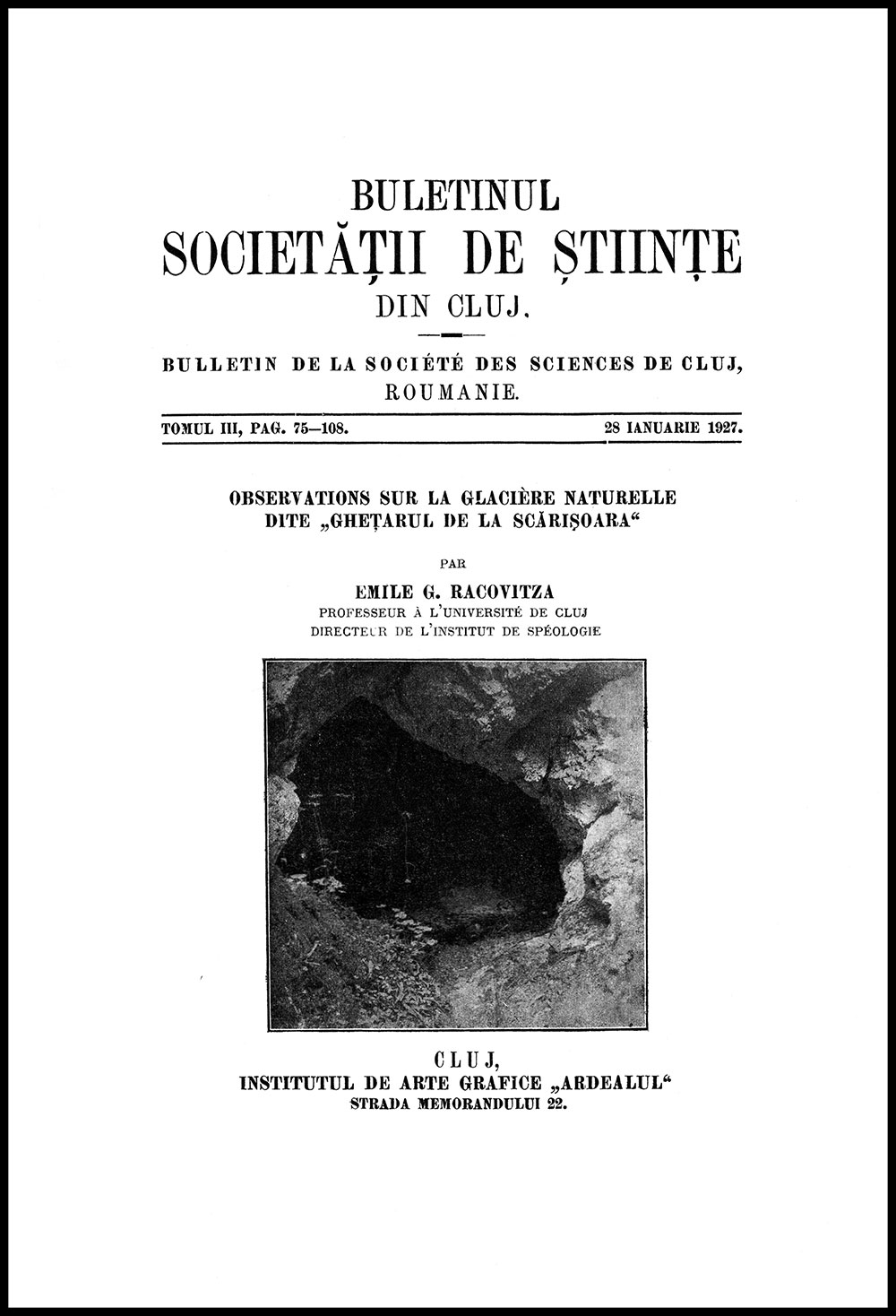 Observations sur la glacière naturelle dite „Gheţarul de la Scărişoara”. Buletinul Societăţii de Ştiinţe din Cluj, Cluj, III, 1927, p. 75-108 + 4 pl.
